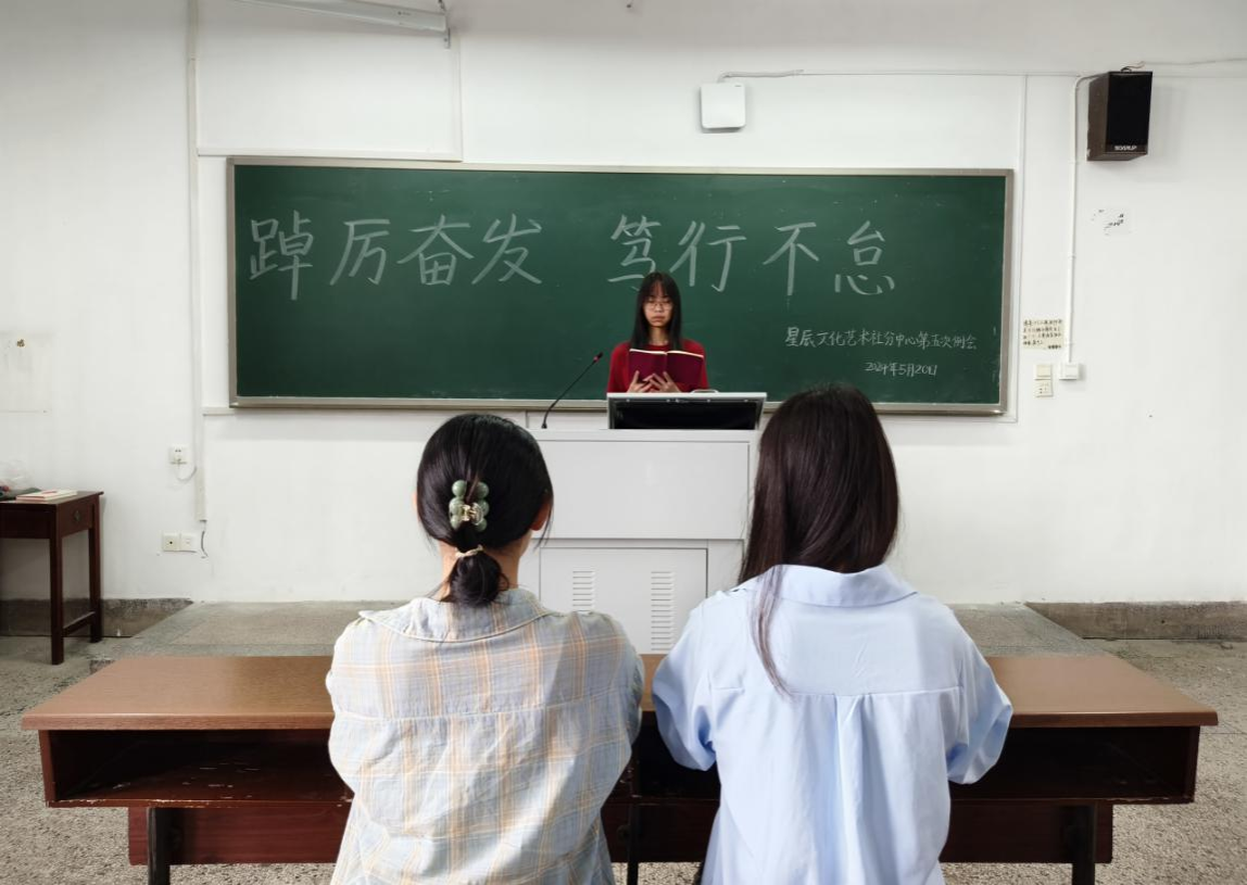 (记者 李博书 赵丙阳 严子依)5月20日中午,我院星辰文化艺术社张公岭分中心理事会在张公岭校区教学楼107教室召开以“踔厉奋发,笃行不怠”为主题的例会。会议由星辰文化艺术社张公岭分中心负责人蒋雯君主持。