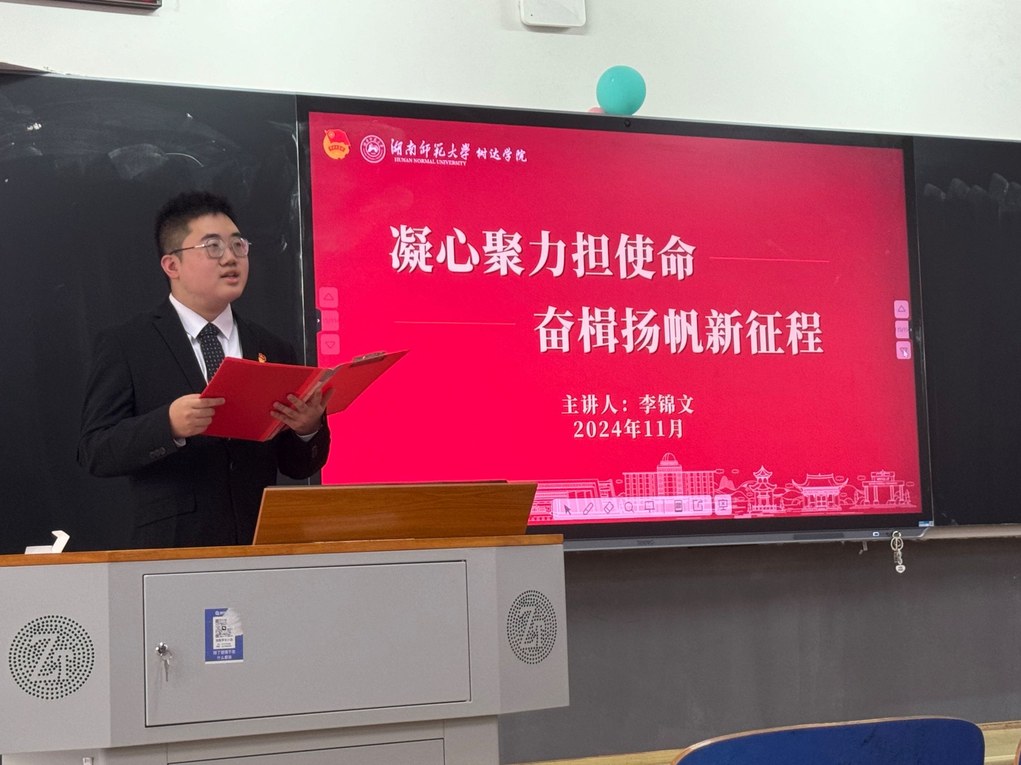 (通讯员 李锦文 赵晶晶 周语含)11月14日中午,我院团委宣传部和青年发展工作部在树达楼115教室联合开展学院2024年秋季树达青年说暨第十四期“先锋团校”学生骨干培训班第一次理论培训活动。院团委书记胡蓉出席活动。院团委组织部部长余嘉程主持。