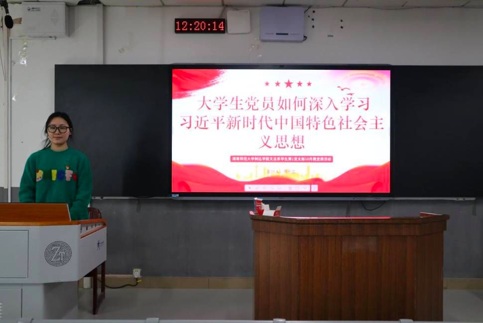 (通讯员 李曼)10月24日中午,学院文法系学生第一党支部在树达楼506教室开展以“大学生党员如何深入学习习近平新时代中国特色社会主义思想”为主题的微党课活动。文法系学生第一党支部第一书记侯祎出席活动。活动由文法系学生第一党支部组织委员李苏文主持。